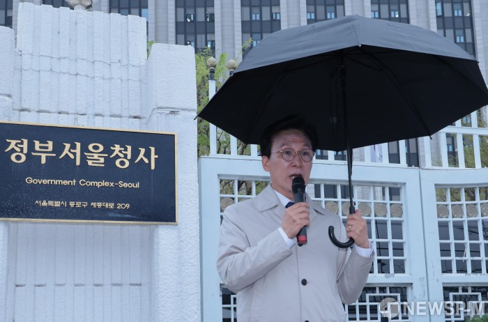 [서울=뉴스핌] 이길동 기자 = 김민석 더불어민주당 최고위원이 18일 오전 서울 종로구 정부서울청사앞에서 한덕수 권한대행 대선 출마 여부 및 윤어게인 신당 관련 입장 표명을 요구하며 1인 시위와 기자회견을 하고 있다.2025.04.18 gdlee@newspim.com