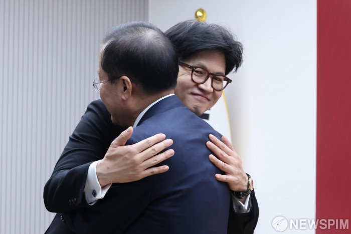 [서울=뉴스핌] 윤창빈 기자 = 한동훈·홍준표 국민의힘 대선 경선 후보가 23일 서울 여의도 국민의힘 중앙당사에서 열린 2차 경선 토론회 미디어데이에서 토론자로 서로를 지명한 뒤 포옹하고 있다. 2025.04.23 pangbin@newspim.com
