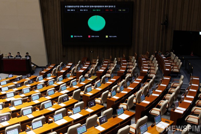 [서울=뉴스핌] 윤창빈 기자 = 1일 오후 서울 여의도 국회에서 열린 본회의에서 검찰총장(심우정) 탄핵소추안의 법제사법위원회로의 회부 동의의 건이 가결되고 있다. 2025.05.01 pangbin@newspim.com