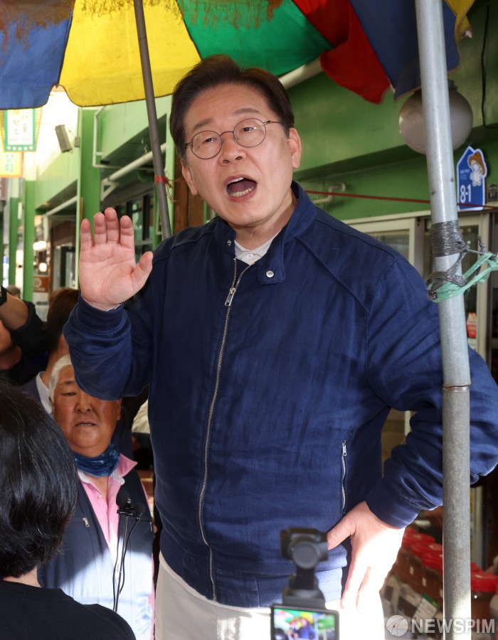 [인제=뉴스핌] 최지환 기자 = 이재명 더불어민주당 대선 후보가 '골목골목 경청투어' 접경지역 방문 이틀째인 2일 오후 강원 인제군 원통시장에서 주민들을 향해 연설하고 있다. 2025.05.02 choipix16@newspim.com