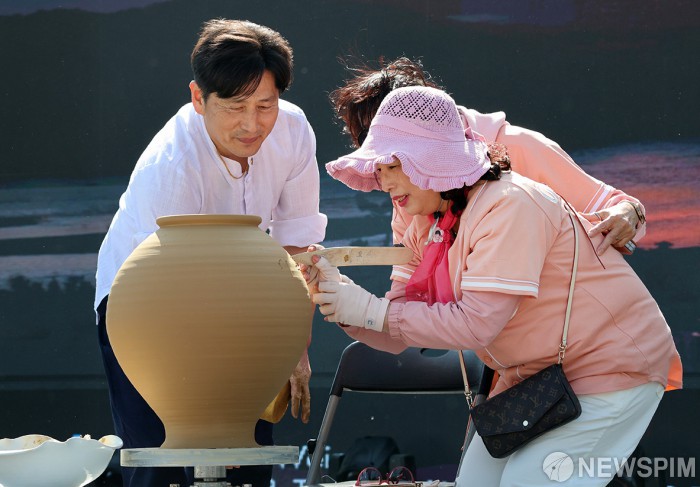 [서울=뉴스핌] 양윤모 기자 = 황금연휴를 맞아 4일 오후 신륵사 관광지 일원서 열린 제37회 여주도자기축제의 남한강출렁다리 북단 메인무대에서 전통도자제작 퍼포먼스가 펼쳐지고 있다. 남한강 출렁다리 개통과 2025 여주관광 원년의 해 선포와 함께하는 올해 축제는 ‘즐겨 봄, 자기야 여강이 출렁인다’라는 주제 아래 11일까지 열린다. [사진=여주시청] 2025.05.04 yym58@newspim.com