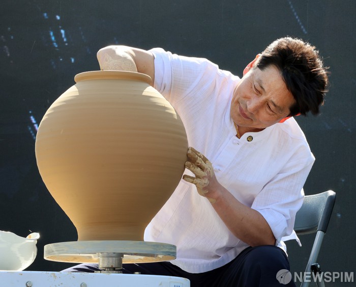 [서울=뉴스핌] 양윤모 기자 = 황금연휴를 맞아 4일 오후 신륵사 관광지 일원서 열린 제37회 여주도자기축제의 남한강출렁다리 북단 메인무대에서 전통도자제작 퍼포먼스가 펼쳐지고 있다. 남한강 출렁다리 개통과 2025 여주관광 원년의 해 선포와 함께하는 올해 축제는 ‘즐겨 봄, 자기야 여강이 출렁인다’라는 주제 아래 11일까지 열린다. [사진=여주시청] 2025.05.04 yym58@newspim.com