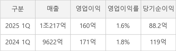 ◆ 1Q 실적, 매출액 1조217억원 전년동기 대비 6.2% 증가... 영업이익 6.8% 감소