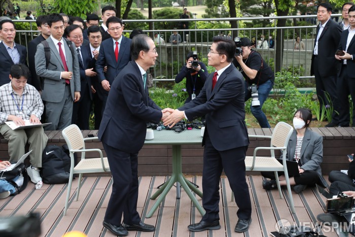 [서울=뉴스핌] 최지환 기자 = 김문수 국민의힘 대선 후보와 한덕수 무소속 대선 예비후보가 8일 국회 사랑재에서 만나 후보 단일화를 위한 2차 회동을 마친 뒤 악수하고 있다. 2025.05.08 choipix16@newspim.com