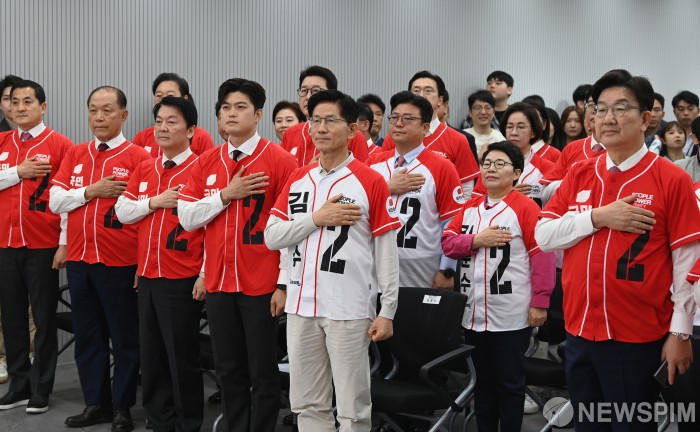 [서울=뉴스핌] 최지환 기자 =김문수 국민의힘 대선 후보가 12일 오전 서울 영등포구 국민의힘 중앙당사에서 열린 중앙선거대책위원회 회의 및 중앙선대위 임명장 수여식에서 국민의례를 하고 있다. 2025.05.12 choipix16@newspim.com
