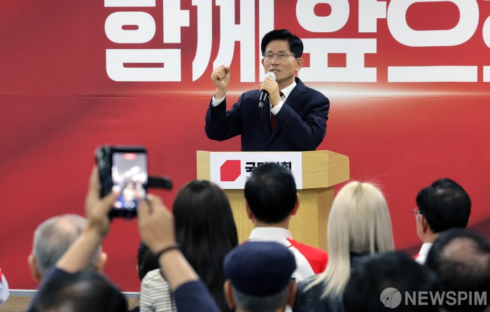 [대전=뉴스핌] 최지환 기자 = 김문수 국민의힘 대선 후보가 12일 대전 동구 대전시당사에서 열린 충청권 선거대책위원회 출정식에서 인사말을 하고 있다. 2025.05.12 choipix16@newspim.com