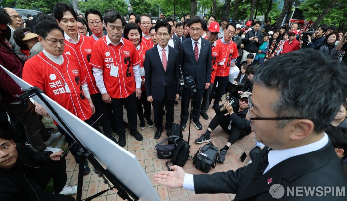 [부산=뉴스핌] 최지환 기자 = 김문수 국민의힘 대선 후보가 13일 부산 남구 부산국제금융센터를 찾아 관계자에게 산업은행 이전 관련 브리핑을 받고 있다. 2025.05.13 choipix16@newspim.com