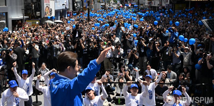 [부산=뉴스핌] 정일구 기자 = 이재명 더불어민주당 대선후보가 14일 부산 서면에서 열린 집중 유세에서 시민들에게 손을 들어 인사하고 있다. 2025.05.14 mironj19@newspim.com