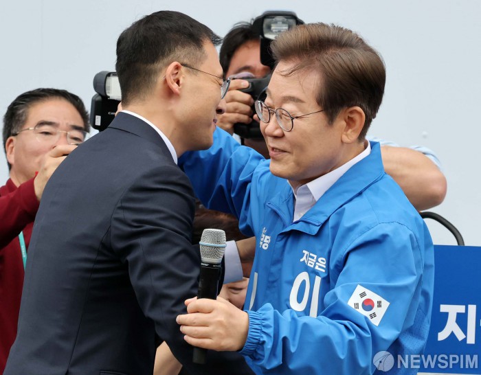 [익산=뉴스핌] 김학선 기자 = 이재명 더불어민주당 대선 후보가 16일 전북 익산역 동부광장 유세에서 최근 국민의힘을 탈당한 김상욱 의원과 포옹하고 있다. 2025.05.16 yooksa@newspim.com