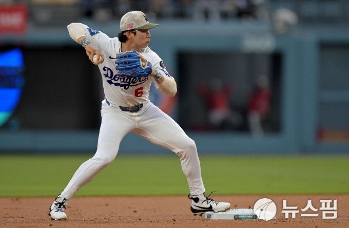 [로스앤젤레스 로이터 =뉴스핌] 박상욱 기자 = 김혜성이 17일 MLB LA 에인절스와의 홈경기 1회 더블 플레이를 위해 1루로 송구하고 있다. 2025.5.17 psoq1337@newspim.com