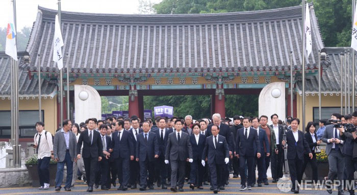 [광주=뉴스핌] 이길동 기자 =김문수 국민의힘 대선 후보가 17일 오전 광주광역시 북구 국립 5·18민주묘지 찾아 참배하기 위해 이동하고 있다. 2025.05.17. gdlee@newspim.com