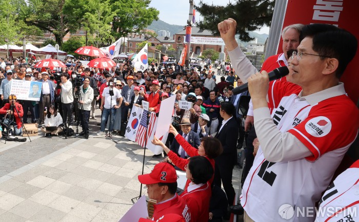 [전주=뉴스핌] 이길동 기자 =김문수 국민의힘 대선 후보가 17일 오후 전북 전주 완산구 전동성당 앞에서 열린 유세에서 시민들에게 지지를 호소하고 있다. 2025.05.17 gdlee@newspim.com