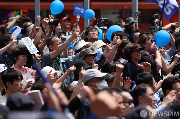 [인천=뉴스핌] 김학선 기자 = 21일 오후 인천광역시 남동구 구월동 구월 로데오광장에서 열린 이재명 더불어민주당 대선 후보의 유세에서 시민들이 이 후보의 연설에 지지를 보내고 있다. 2025.05.21 yooksa@newspim.com