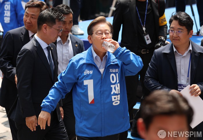 [인천=뉴스핌] 김학선 기자 = 이재명 더불어민주당 대선 후보가 21일 오후 인천광역시 남동구 구월동 구월 로데오광장에서 연설을 마친 후 무대에서 내려와 물을 마시고 있다. 2025.05.21 yooksa@newspim.com