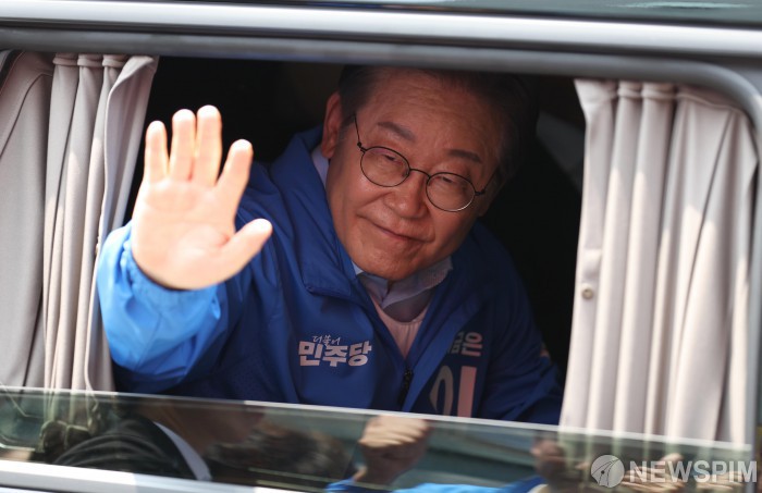 [인천=뉴스핌] 김학선 기자 = 이재명 더불어민주당 대선 후보가 21일 오후 인천광역시 남동구 구월동 구월 로데오광장에서 유세를 마친 후 차량을 타고 이동하며 시민들에게 인사하고 있다. 2025.05.21 yooksa@newspim.com