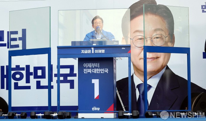 [인천=뉴스핌] 김학선 기자 = 이재명 더불어민주당 대선후보가 21일 오후 인천 서구 롯데마트앞에서 열린 유세에서 지지를 호소하고 있다. 2025.05.21 yooksa@newspim.com