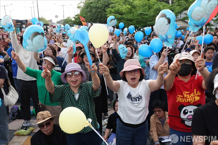 [인천=뉴스핌] 김학선 기자 = 21일 오후 인천 계양구 계양역 앞에서 열린 이재명 더불어민주당 대선 후보의 선거유세에서 시민들이 이 후보에게 환호를 보내고 있다. 2025.05.21 yooksa@newspim.com
