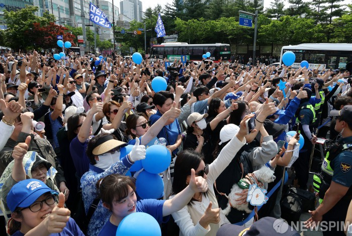 [용인=뉴스핌] 정일구 기자 = 26일 오후 경기 용인시 단국대 죽전캠퍼스 정문 앞에서 열린 이재명 더불어민주당 대선 후보의 용인 유세에서 시민들이 이 후보를 연호하고 있다. 2025.05.26 mironj19@newspim.com
