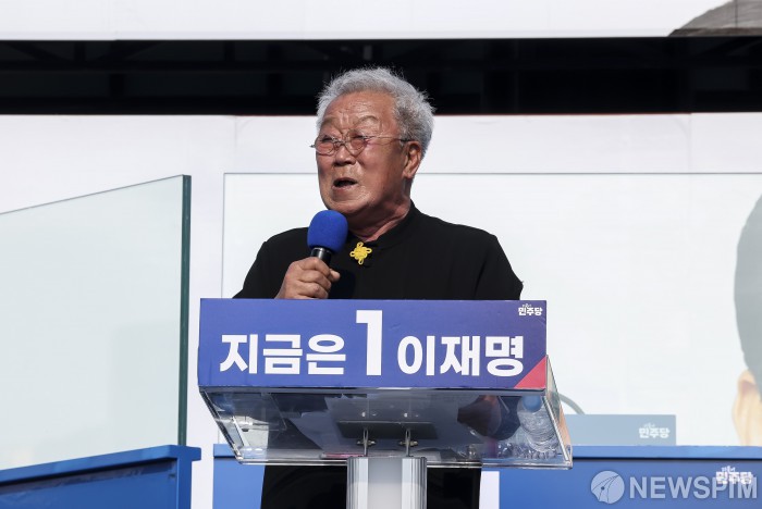 [남양주=뉴스핌] 정일구 기자 = 배우 명계남 씨가 26일 경기 남양주시 평내호평역 광장에서 열린 이재명 더불어민주당 대선 후보의 유세에서 지지발언을 하고 있다. 2025.5.26. 2025.05.26 mironj19@newspim.com