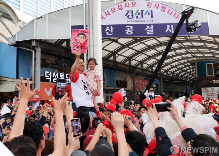 [경산=뉴스핌] 최지환 기자 = 김문수 국민의힘 대선후보가 28일 오후 경북 경산시 경산공설시장에서 열린 유세현장에서 한 어린이에게 그림을 선물 받고 기념촬영을 하고 있다. 2025.05.28 choipix16@newspim.com