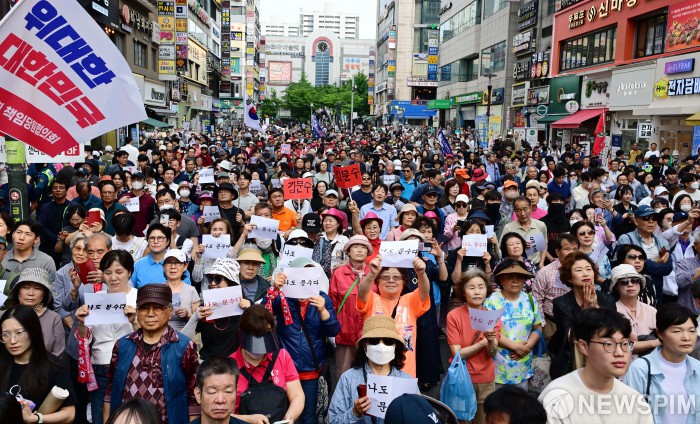 [산본=뉴스핌] 최지환 기자 = 김문수 국민의힘 대선후보 지지자들이 29일 오후 경기 군포시 산본역 로데오거리 원형광장에서 열린 유세현장에서 환호를 하고 있다. 2025.05.29 choipix16@newspim.com
