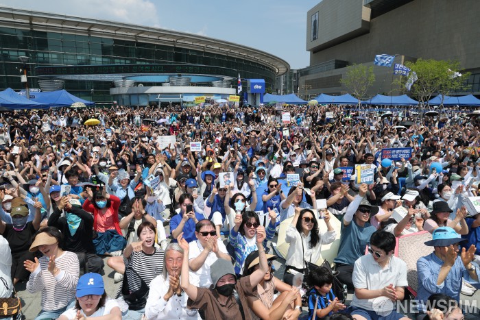 [대구=뉴스핌] 윤창빈 기자 = 1일 대구광역시 동대구역 광장의 이재명 후보 유세장을 찾은 지지자들이 이 후보의 연설에 환호하고 있다. 2025.06.01 pangbin@newspim.com