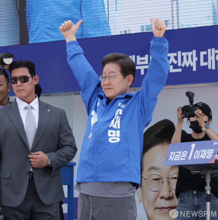 [대구=뉴스핌] 윤창빈 기자 = 이재명 더불어민주당 대선후보가 1일 대구 동대구역광장에서 열린 유세에서 손을 들어 인사하고 있다. 2025.06.01 pangbin@newspim.com