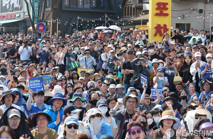 [울산=뉴스핌] 윤창빈 기자 = 1일 오후 울산 동구 일산해수욕장 앞에서 열린 이재명 더불어민주당 대선 후보 유세 현장에서 지지자들이 지켜보고 있다. 2025.06.01 pangbin@newspim.com