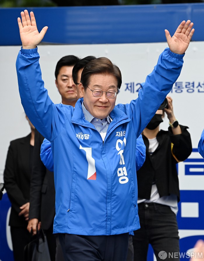 [성남=뉴스핌] 정일구 기자 = 이재명 더불어민주당 대선 후보가 2일 오후 경기 성남시 야탑역 광장에서 열린 선거유에서 지지자들에게 인사를 하고 있다. 2025.06.02 mironj19@newspim.com