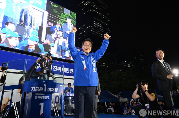 [서울=뉴스핌] 정일구 기자 = 이재명 더불어민주당 대통령 선거 후보가 2일 서울 영등포구 여의도공원에서 열린 피날레 유세에서 지지자들에게 인사하고 있다. 2025.06.02 mironj19@newspim.com