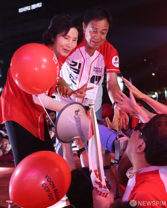 [서울=뉴스핌] 윤창빈 기자 = 김문수 국민의힘 대선 후보의 배우자 설난영 여사가 2일 오후 서울 중구 시청광장에서 열린 "울려라 함성, 들어라 승리의 메아리" 서울 피날레 총유세를 마치고 시민들과 인사하고 있다. 2025.06.02 pangbin@newspim.com