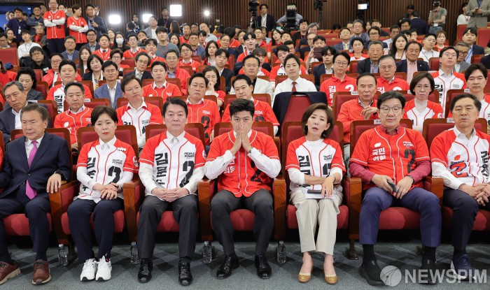 [서울=뉴스핌] 정일구 기자 = 3일 서울 여의도 국회 도서관에 마련된 국민의힘 개표 상황실에서 선대위원장들이 제21대 대통령 선거 방송3사 출구조사 결과를 보고 있다. 왼쪽부터 손학규, 양향자, 안철수, 김용태, 나경원, 권성동, 김기현. 2025.06.03 mironj19@newspim.com