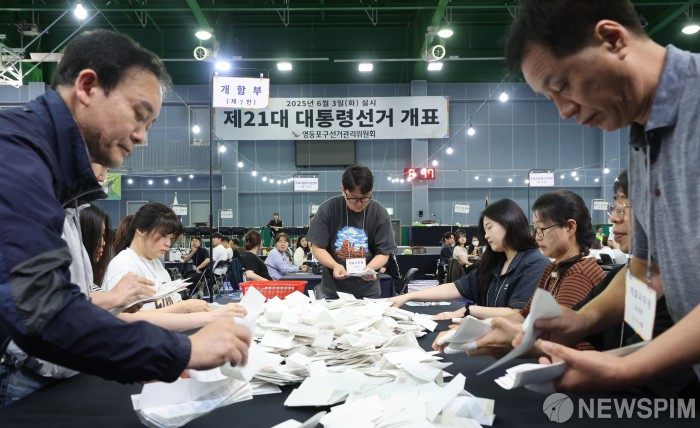 [서울=뉴스핌] 김학선 기자 = 제21대 대통령선거 투표가 끝난 3일 밤 서울 영등포 다목적 배드민턴 체육관에 마련된 개표소에서 개표작업이 한창이다. 2025.06.03 yooksa@newspim.com