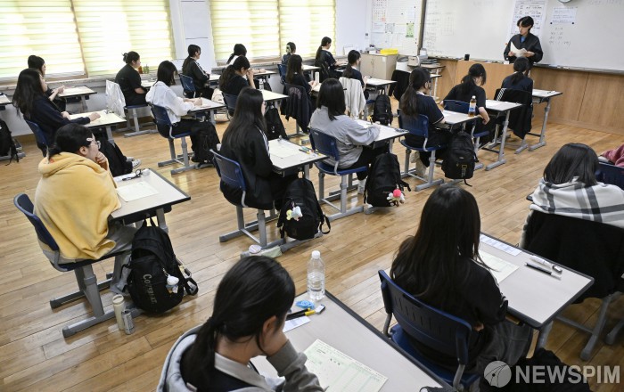 [서울=뉴스핌] 사진공동취재단 = 2026학년도 대학수학능력시험 6월 모의평가 시행일인 4일 서울 영등포구 여의도여자고등학교에서 학생들이 시험 준비를 하고 있다. 2025.06.04 photo@newspim.com