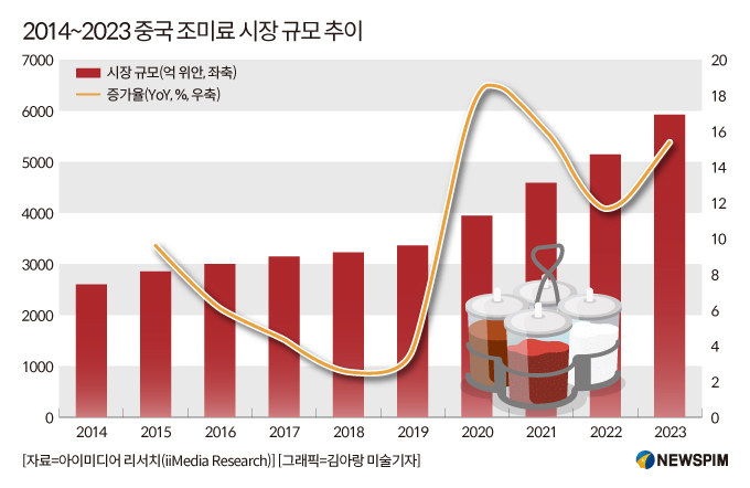 2014~2023년 중국 조미료 시장 규모는 2595억 위안에서 5923억 위안으로 증가했고, 연평균 성장률은 9.6%에 달한다.