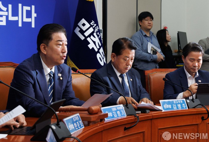 [서울=뉴스핌] 윤창빈 기자 = 김병기 더불어민주당 대표 직무대행 겸 원내대표가 18일 오전 서울 여의도 국회에서 열린 최고위원회의에서 모두발언을 하고 있다. 2025.06.18 pangbin@newspim.com