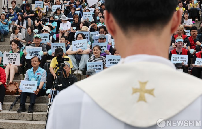 [서울=뉴스핌] 김학선 기자 = 21일 서울역 광장에서 아리셀 중대재해참사 대책위원회와 아리셀 산재 피해 가족협의회 주최로 1주기 추모대회가 열린 가운데 3대 종단 추도제가 진행되고 있다. 2025.06.21 yooksa@newspim.com