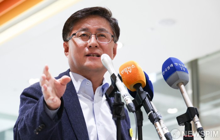 [서울=뉴스핌] 최지환 기자 = 김성환 환경부 장관 후보자가 24일 오전 서울 영등포구 이룸센터에 마련된 인사청문회 준비 사무실로 출근하며 취재진 질문에 답변하고 있다. 2025.06.24 choipix16@newspim.com