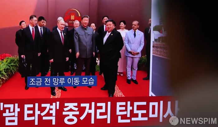 [서울=뉴스핌] 김학선 기자 = 3일 서울 중구 서울역에 설치된 TV에 중계되는 중국 전승절 열병식 행사에서 시진핑 중국 국가주석과 블라디미르 푸틴 러시아 대통령, 김정은 북한 국무위원장이 참석한 장면이 나오고 있다. 2025.09.03 yooksa@newspim.com