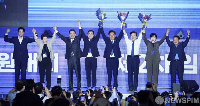 [고양=뉴스핌] 윤창빈 기자 = 정청래 더불어민주당 신임 당대표와 황명선 최고위원을 비롯한 지도부가 2일 경기 고양시 킨텍스에서 열린 제2차 임시전국당원대회에서 당원들을 향해 손을 들어보이고 있다. 2025.08.02 pangbin@newspim.com