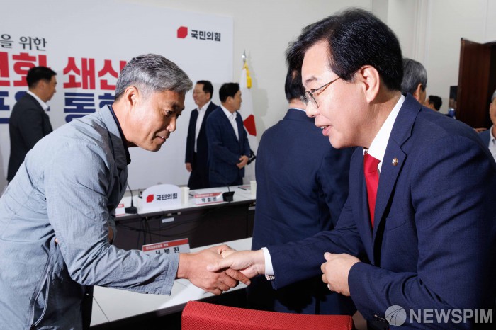 [서울=뉴스핌] 윤창빈 기자 = 송언석 국민의힘 비상대책위원장 겸 원내대표가 4일 오전 서울 여의도 국회에서 열린 한미 관세협상 농업분야 간담회에서 농업 관계자와 인사를 나누고 있다. 2025.08.04 pangbin@newspim.com