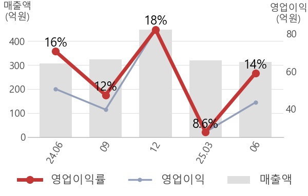 영업이익률을 자세히 살펴보면, 매출은 312억으로 전년동기 대비해서 1.7% 증가한 반면, 영업이익은 43.4억으로 14% 감소하였다. 매출은 크게 변하지 않았지만 영업이익이 감소하여 영업이익률도 하락한 것을 알 수 있다.