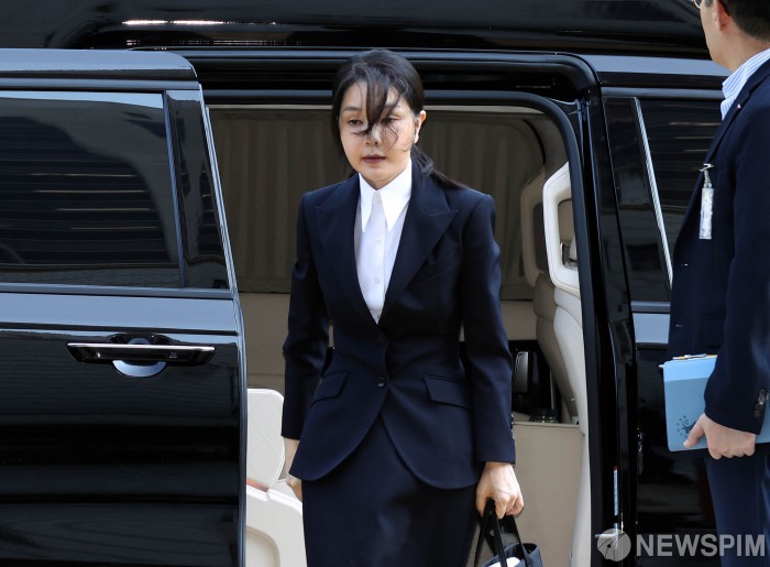 [서울=뉴스핌] 사진공동취재단 = 자본시장과 금융투자업에 관한 법률 위반, 정치자금법 위반, 특정범죄 가중처벌 등에 관한 법률 위반(알선수재) 등의 혐의를 받는 윤석열 전 대통령 부인 김건희 여사가 12일 오전 서울 서초구 서울중앙지법에서 열린 구속 전 피의자 심문(영장실질심사)에 출석하고 있다. 2025.08.12 leehs@newspim.com