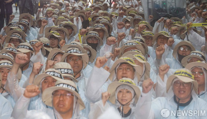 [서울=뉴스핌] 류기찬 인턴기자 = 일본군 '위안부' 피해자 기림의 날을 하루 앞둔 13일 오후 서울 종로구 일본대사관 앞에 모인 수요집회 참석자들이 구호를 외치고 있다. 2025.08.13 ryuchan0925@newspim.com