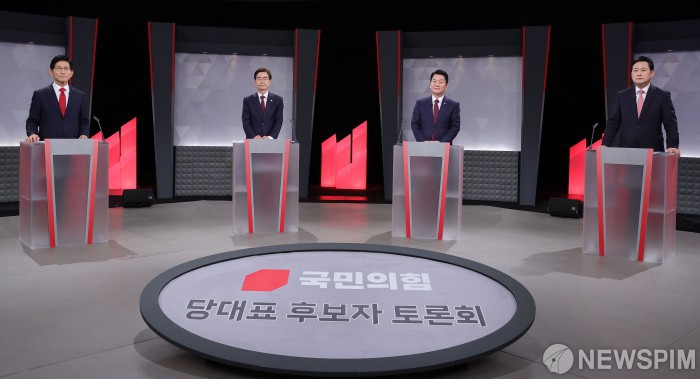 [서울=뉴스핌] 양윤모 기자 = 국민의힘 당대표 후보들이 17일 서울 여의도 KBS에서 열린 2차 TV토론회에 앞서 포즈를 취하고 있다. 김문수(왼쪽부터), 조경태, 안철수, 장동혁 국민의힘 당대표 후보 [국회사진기자단] 2025.08.17 yym58@newspim.com