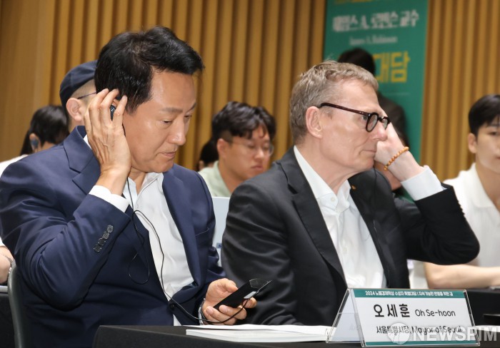 [서울=뉴스핌] 양윤모 기자 = 오세훈 서울시장이 21일 오전 서울시청 본관 3층 대회의실에서 2024년 노벨경제학상 수상자인 제임스 A. 로빈슨 미국 시카고대학교 교수와 '지속가능한 번영을 위한 길'을 주제로 특별대담에 참석 리시버를 점검하고 있다. 2025.08.21 yym58@newspim.com