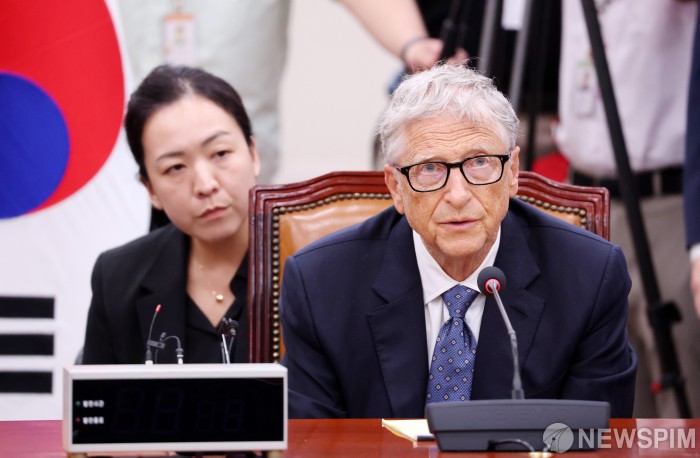 [서울=뉴스핌] 정일구 기자 = 빌 게이츠 게이츠재단 이사장이 21일 오후 서울 여의도 국회에서 열린 외교통일위원회 간담회에 참석해 인사말을 하고 있다. 2025.08.21 mironj19@newspim.com