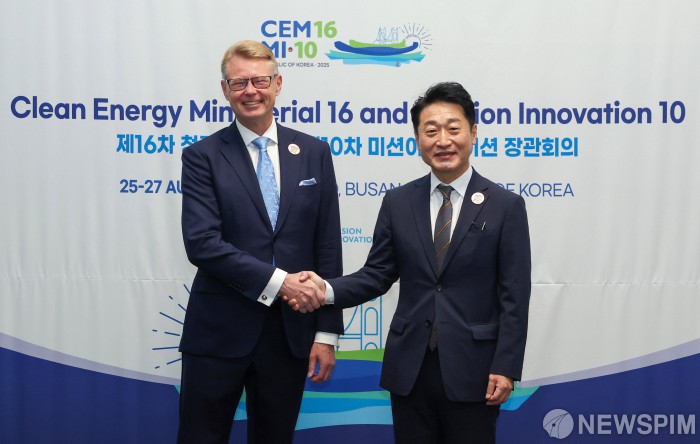 [서울=뉴스핌] 이호현 산업통상자원부 2차관이 26일부산 해운대구 벡스코에서 열린 ‘제16차 청정에너지 장관회의 및 제10차 미션이노베이션 장관회의’에서 미카 뉘카넨 핀란드 고용경제부 차관과 악수를 하고 있다. [사진=산업통상자원부] 2025.08.26 photo@newspim.com