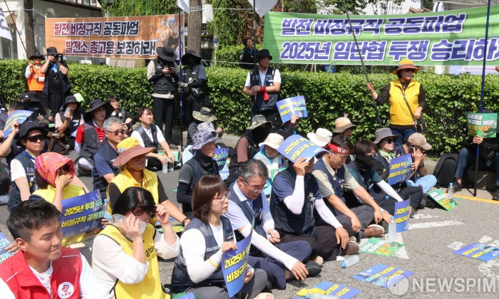 [서울=뉴스핌] 양윤모 기자 = 민주노총 공공운수노조 조합원들이 27일 오후 서울 용산구 삼각지역 부근에서 '발전 비정규직 노동자 총파업 대회'를 개최하고 있다. 집회 참석자들은 올해 말 태안화력 1호기를 시작으로 석탄화력발전소 폐쇄에 따른 고용 보장 방안을 요구했다. 2025.08.27 yym58@newspim.com