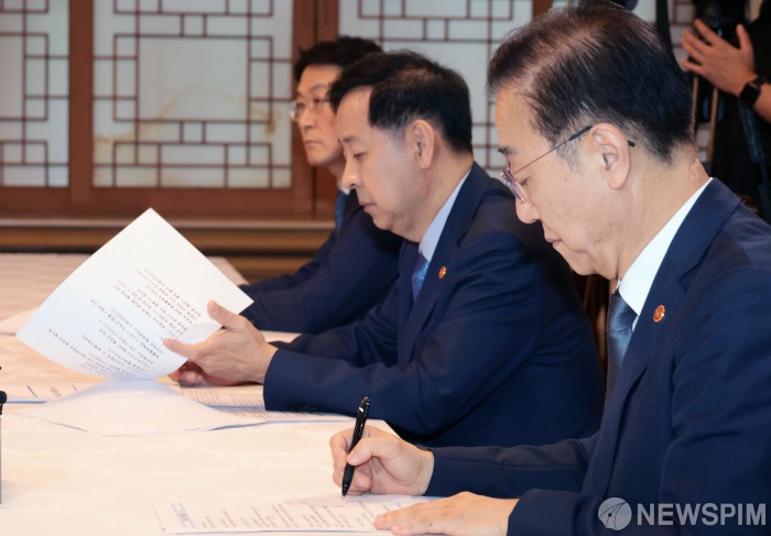 [서울=뉴스핌] 이길동 기자 = 구윤철 부총리 겸 기획재정부 장관과 김윤덕 국토교통부 장관이 7일 서울 종로구 정부서울청사에서 열린 부동산 관계 장관 회의에 참석해 자료를 검토하고 있다. 2025.09.07 gdlee@newspim.com